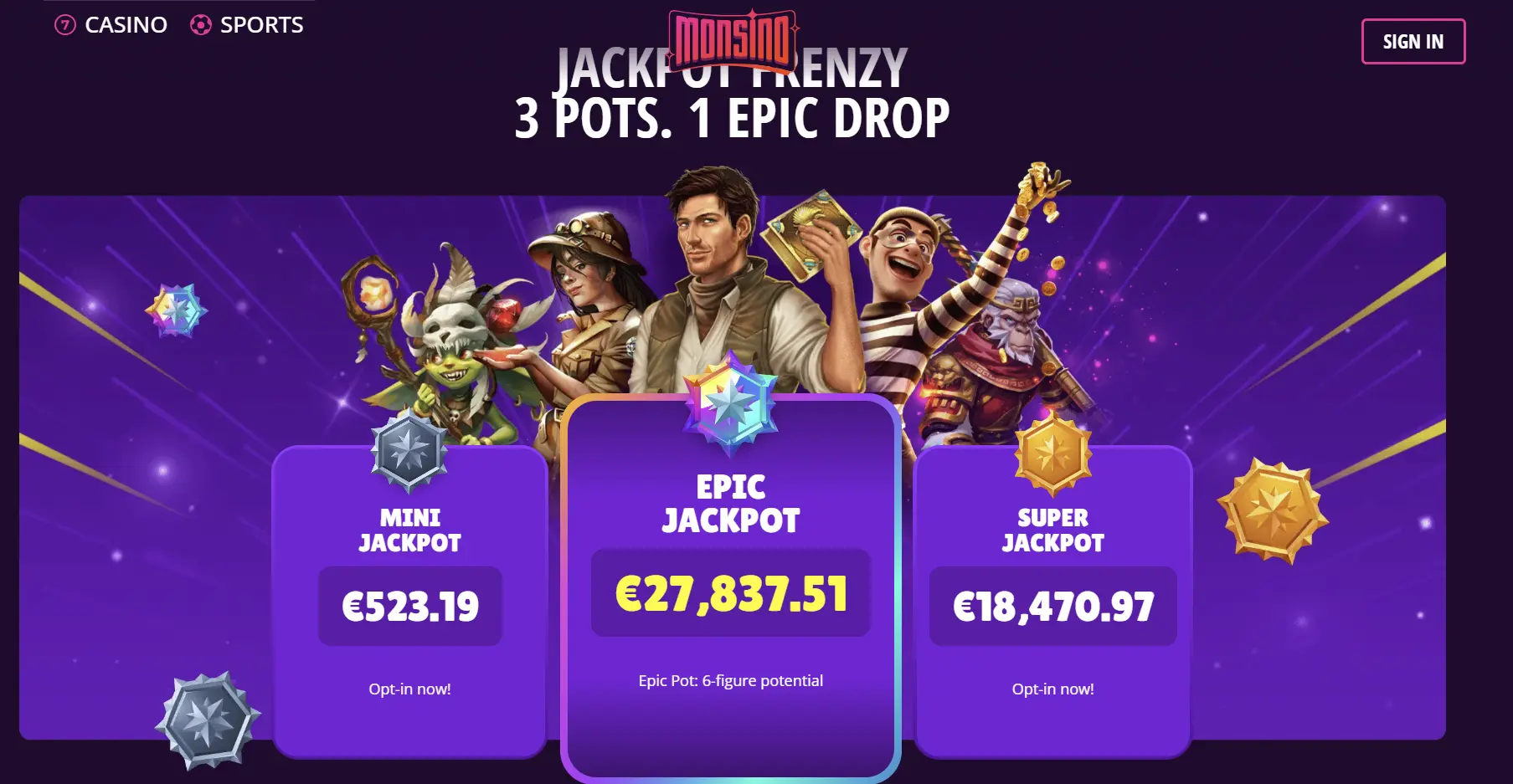Monsino Casino erbjuder Jackpot Frenzy med tre progressiva potter: Mini, Super och Epic. Dessa kan triggas slumpmässigt och Epic-jackpotten kan nå sexsiffriga belopp.